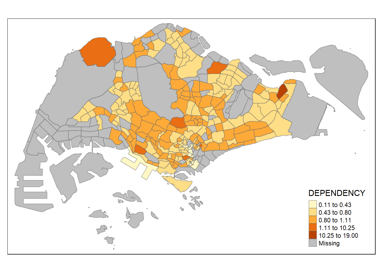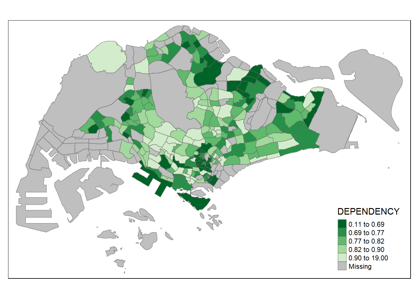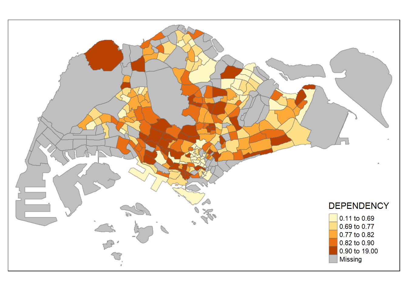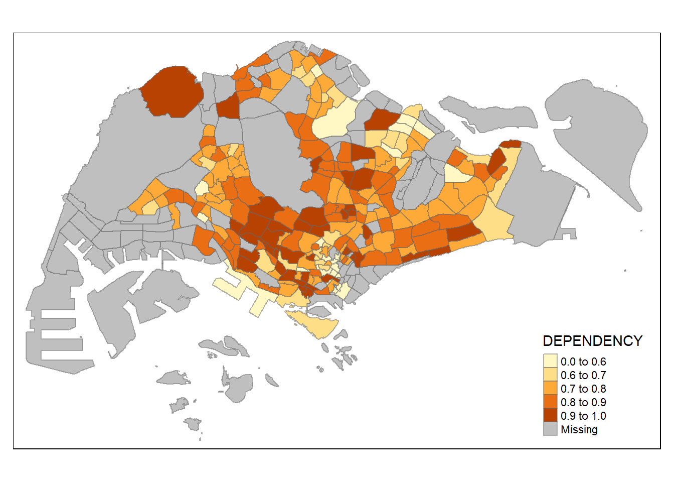 With reference to the summary results above, the break points are set at 0.60, 0.70, 0.80, and 0.90, with 0 set as minimum, and 1.00 set as maximum. The choropleth map is then plotted using the custom breaks.