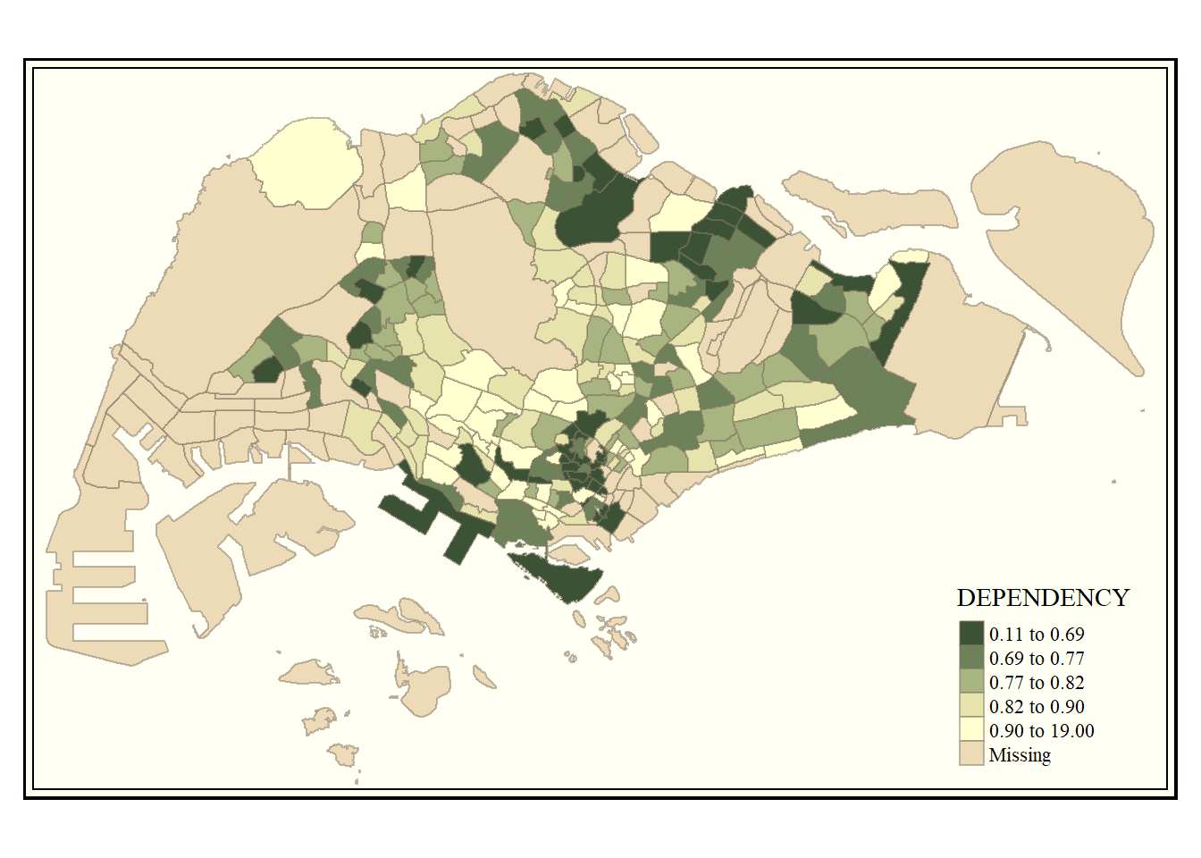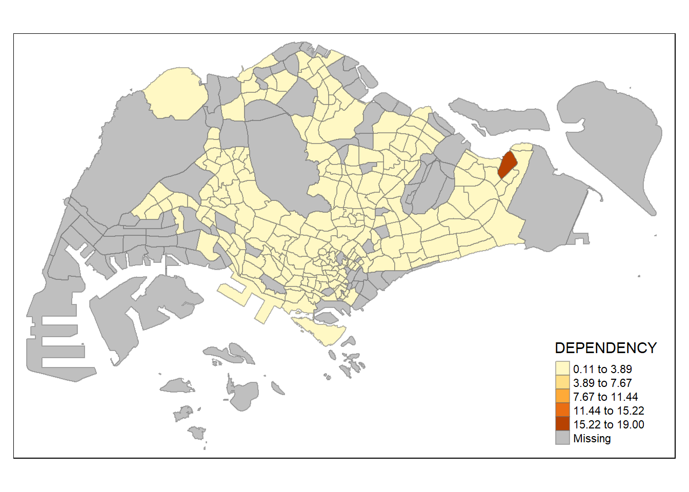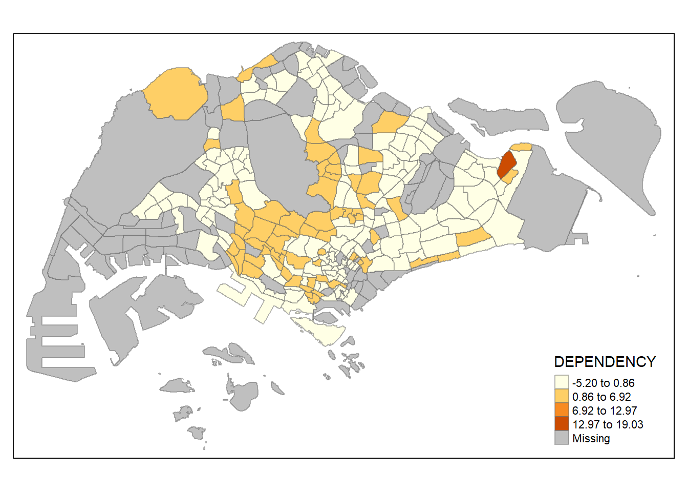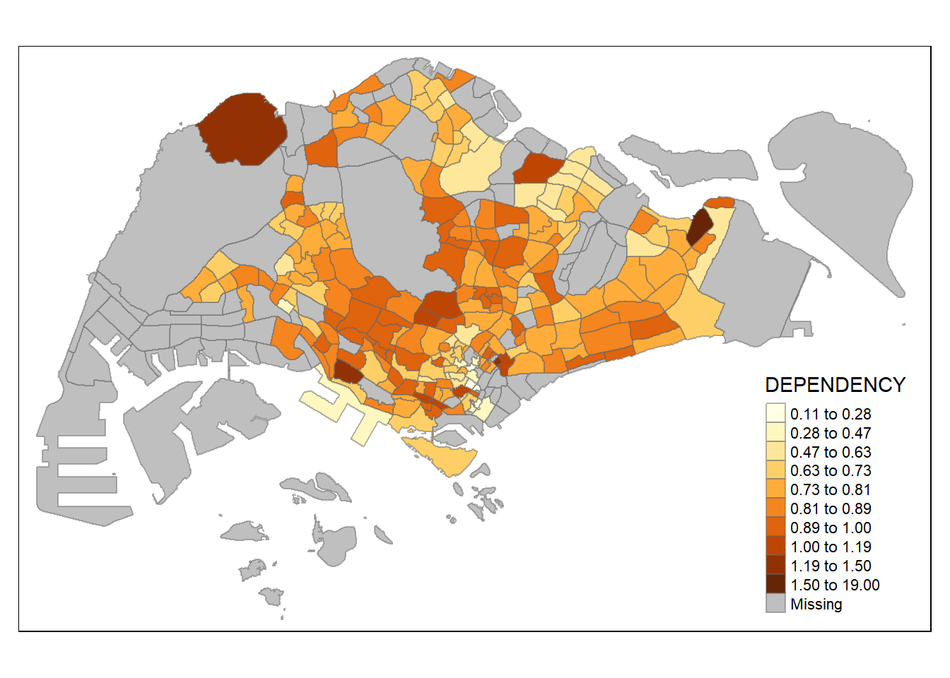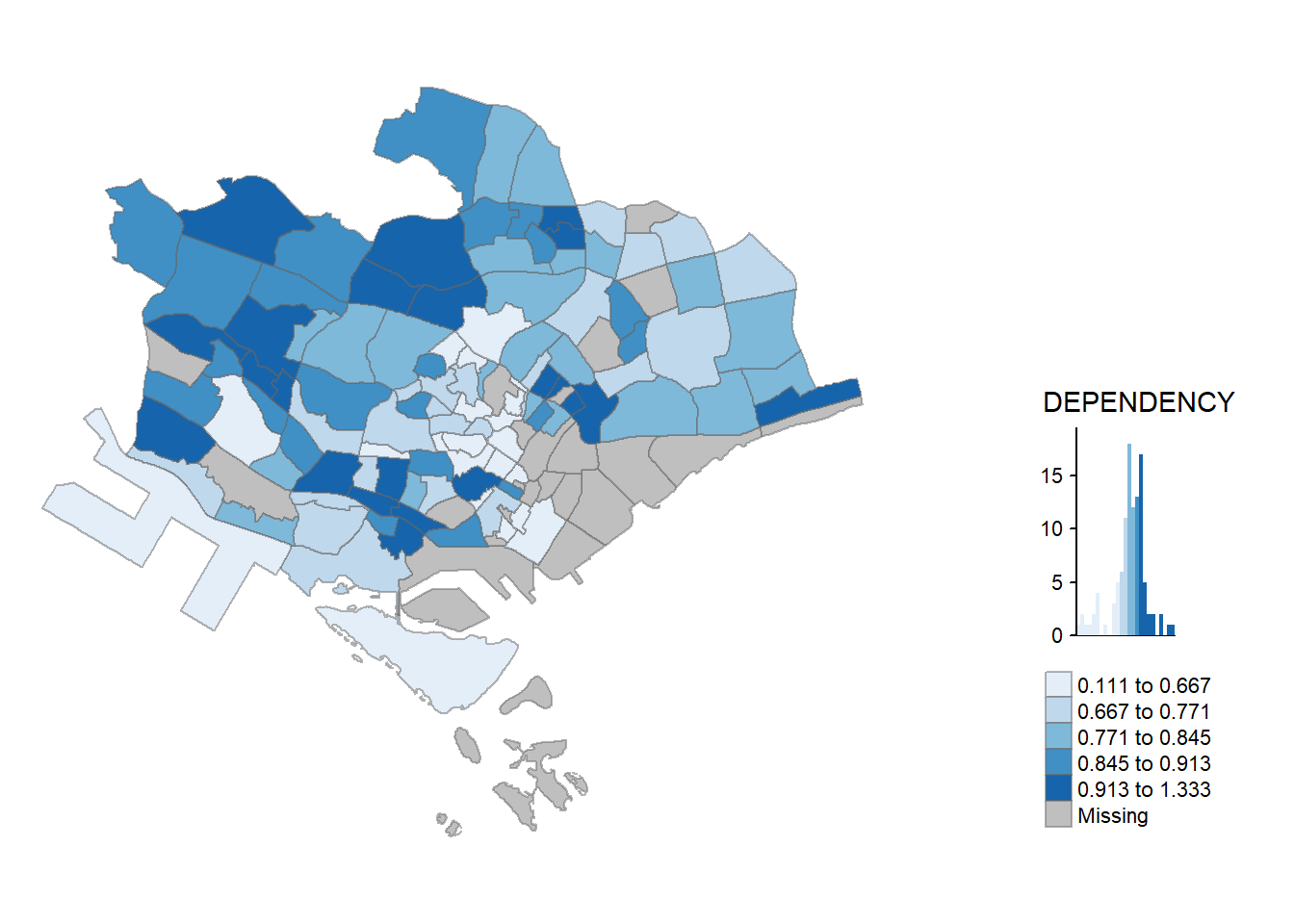 With reference to the summary results above, the break points are set at 0.60, 0.70, 0.80, and 0.90, with 0 set as minimum, and 1.00 set as maximum. The choropleth map is then plotted using the custom breaks.