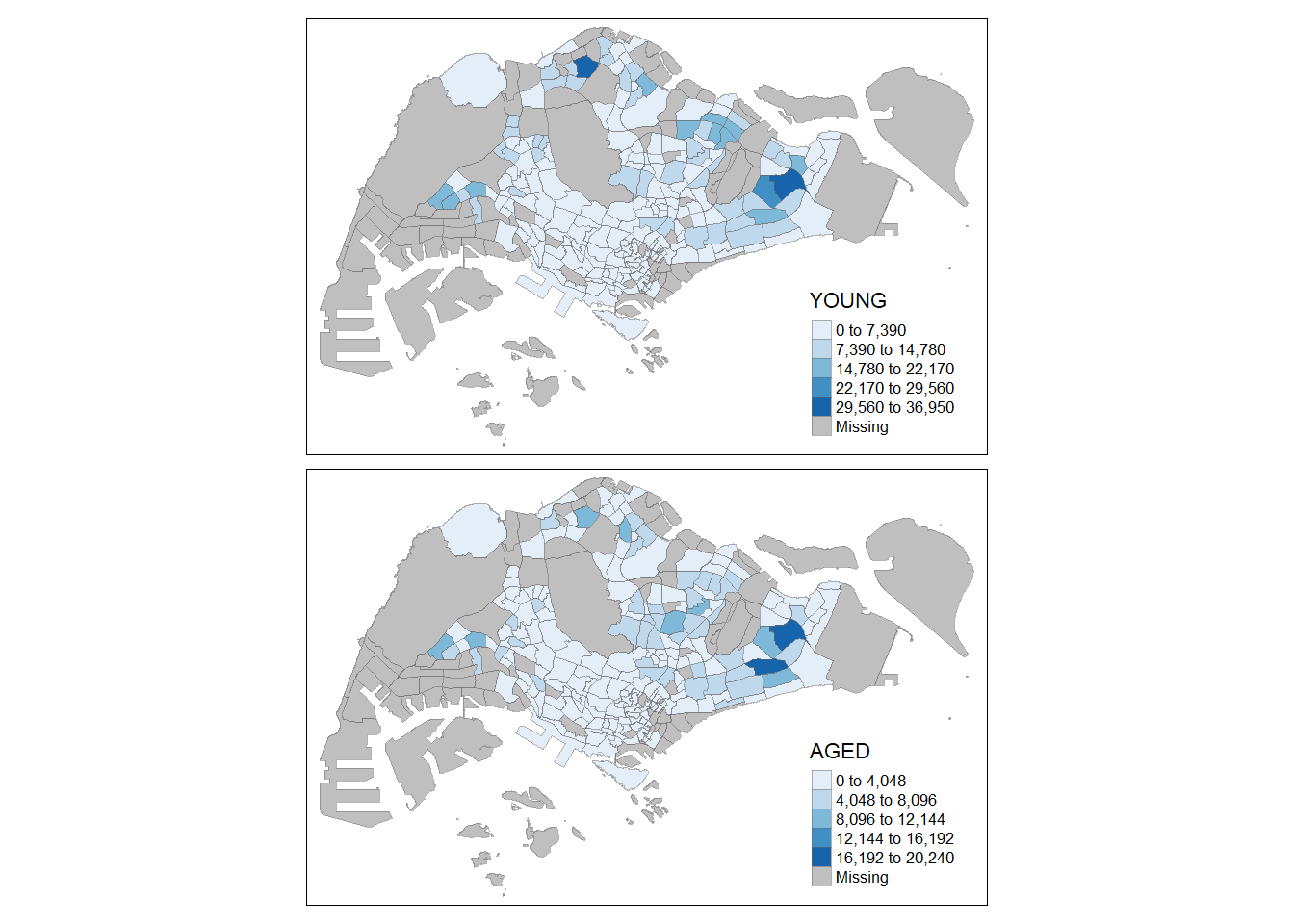 Choropleth mapping involves the symbolisation of enumeration units, such as countries, provinces, states, counties or census units, using area patterns or graduated colors. For example, a social scientist may need to use a choropleth map to portray the spatial distribution of aged population of Singapore based on the Master Plan 2014 subzone boundaries.