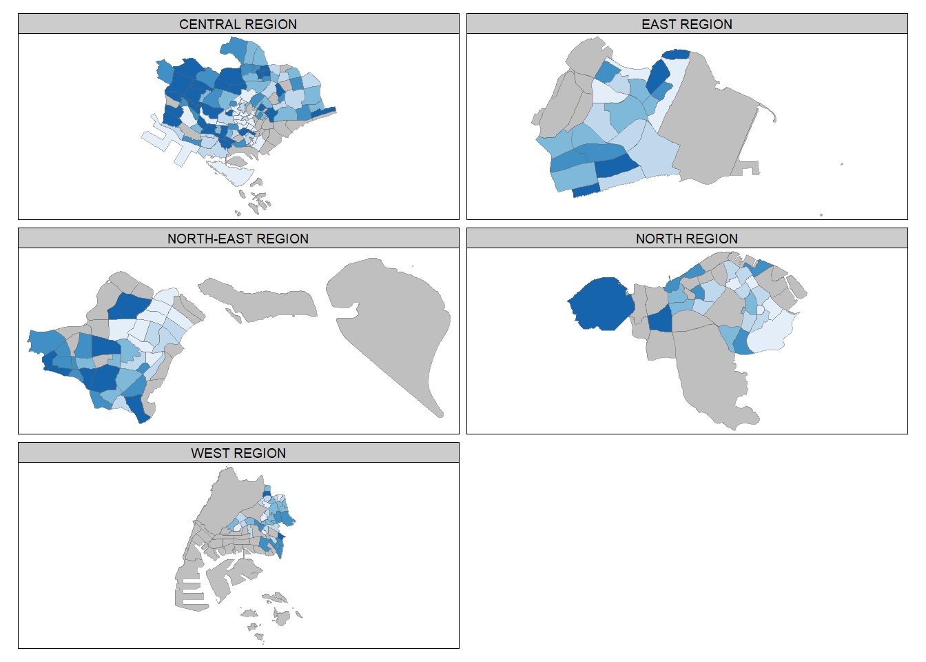 Instead of creating small multiple choropleth maps, the selection function to map spatial objects meeting the selection criterion can also be used. The map below is for the Central Region only.