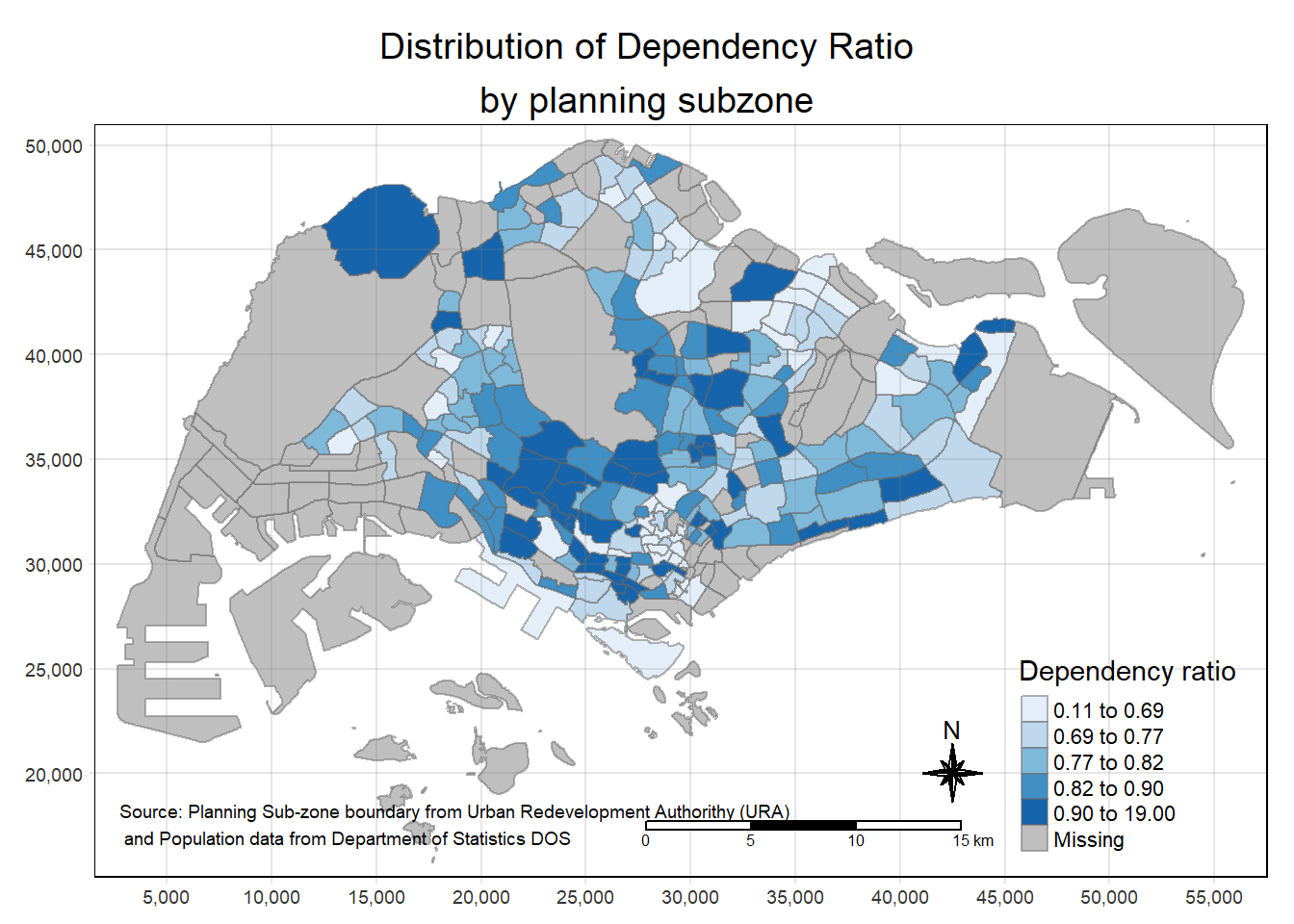 tm_layout(main.title = "Distribution of Dependency Ratio \nby planning subzone",